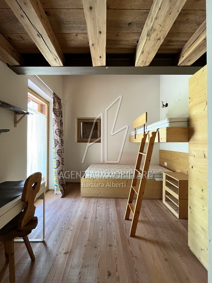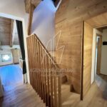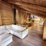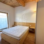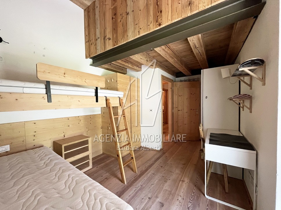 Al primo piano, l’abitazione si apre su un ampio soggiorno con zona pranzo e cucina a vista, perfettamente integrata nello spazio e realizzata su misura, ideale per momenti di convivialità. Lo stesso livello ospita due camere da letto e due bagni, finemente rifiniti con materiali di qualità e stile montano.
